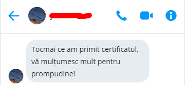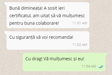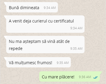 Elaborarea unui certificat durează în mod normal o zi lucrătoare. În anumite situații, este posibil ca certificatul să fie realizat chiar în aceeași zi, într-un interval de câteva ore de la comandă. În orice caz, te voi anunța care este termenul exact după plasarea comenzii.