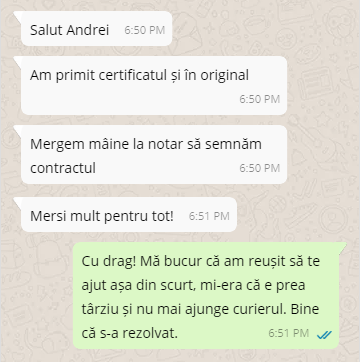 O copie a certificatului trebuie sa ajungă urgent la bancă sau la notar? Nicio problemă! Îl primești scanat, prin e-mail (de cele mai multe ori, chiar în aceeași zi)!